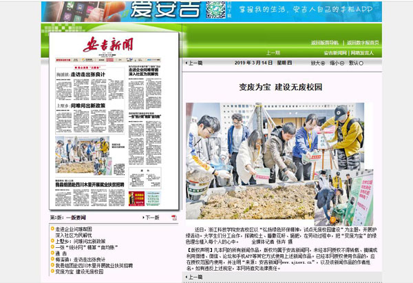 近日,浙江科技学院安吉校区以“弘扬绿色环保精神,试点无废校园建设”为主题,开展护绿活动。大学生们分工合作,挥锄松土、播撒花籽、施肥,在劳动过程中,把“变废为宝”的绿色理念植入每个人的心中。