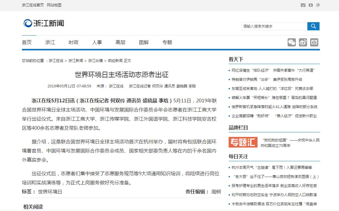 5月11日,2019年联合国世界环境日全球主场活动、中国环境与发展国际合作委员会年会志愿者在浙江工商大学举行出征仪式。来自浙江工商大学、浙江传媒学院、浙江外国语学院、浙江科技学院安吉校区等400余名志愿者及带队老师参加。