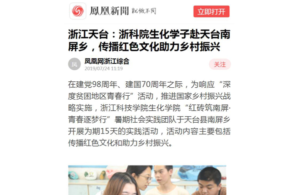 在建党98周年、建国70周年之际,为响应“深度贫困地区青春行”活动,推进国家乡村振兴战略实施,浙江科技学院生化学院“红砖筑南屏·青春逐梦行”暑期社会实践团队于天台县南屏乡开展为期15天的实践活动,活动内容主要包括传播红色文化和助力乡村振兴。