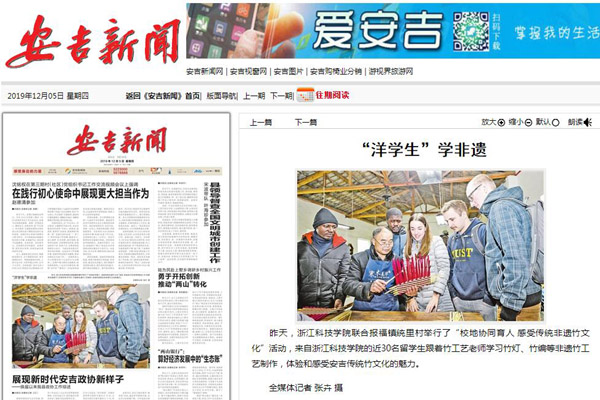昨天,浙江科技学院联合报福镇统里村举行了“校地协同育人 感受传统非遗竹文化”活动,来自浙江科技学院的近30名留学生跟着竹工艺老师学习竹灯、竹编等非遗竹工艺制作,体验和感受安吉传统竹文化的魅力。