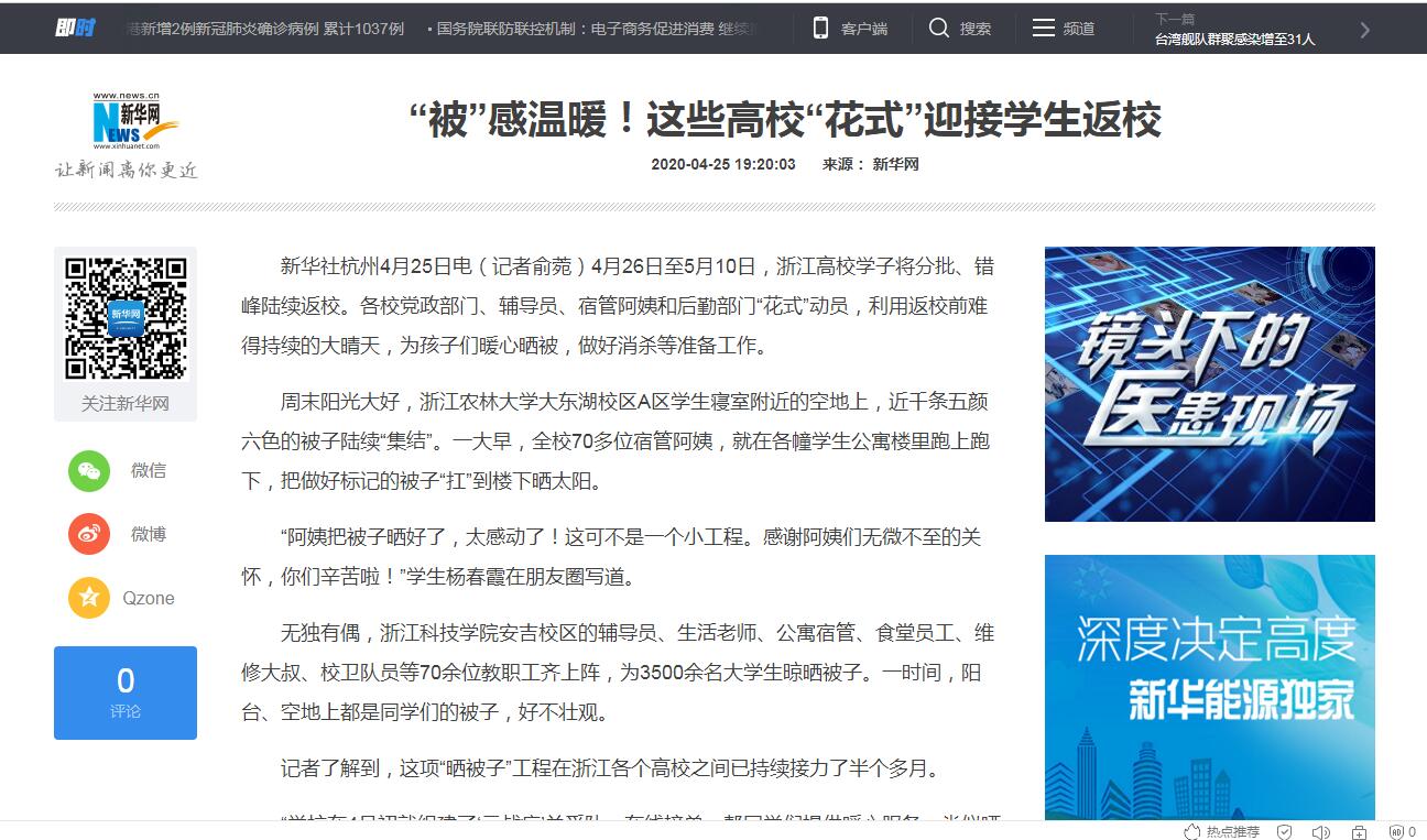 记者了解到,这项“晒被子”工程在浙江各个高校之间已持续接力了半个多月。