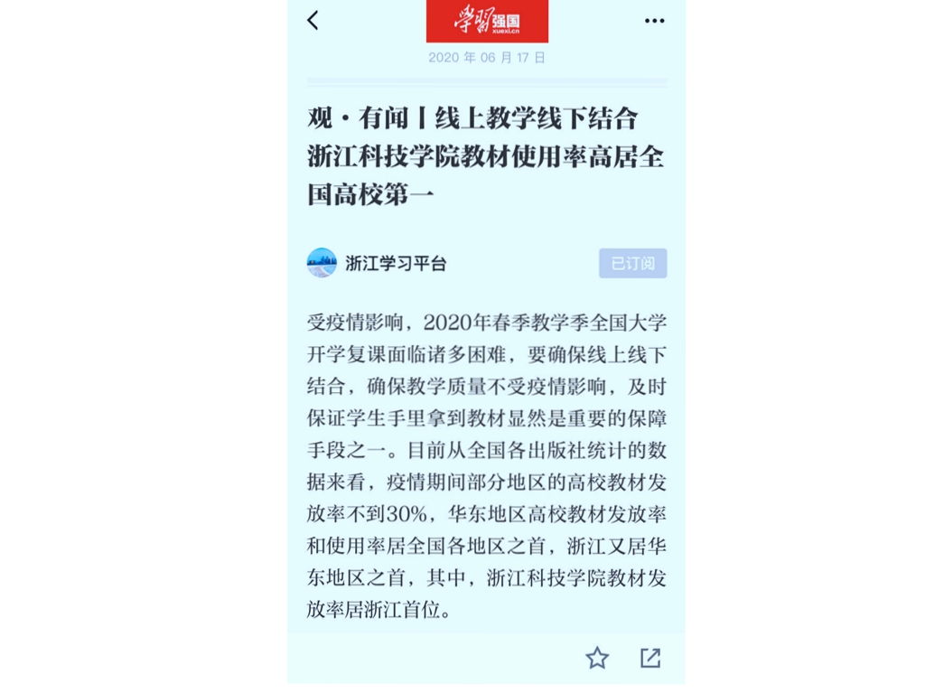 学习强国、都市快报 :线上教学线下结合 浙江科技学院教材使用率高居全国高校第一
