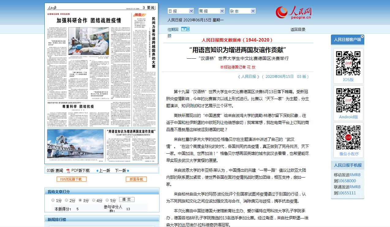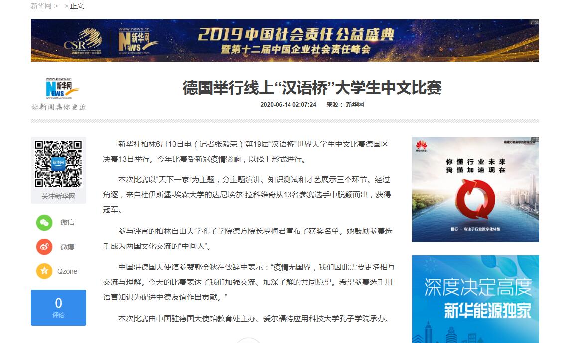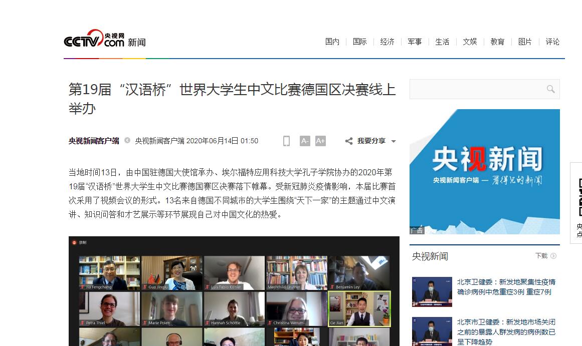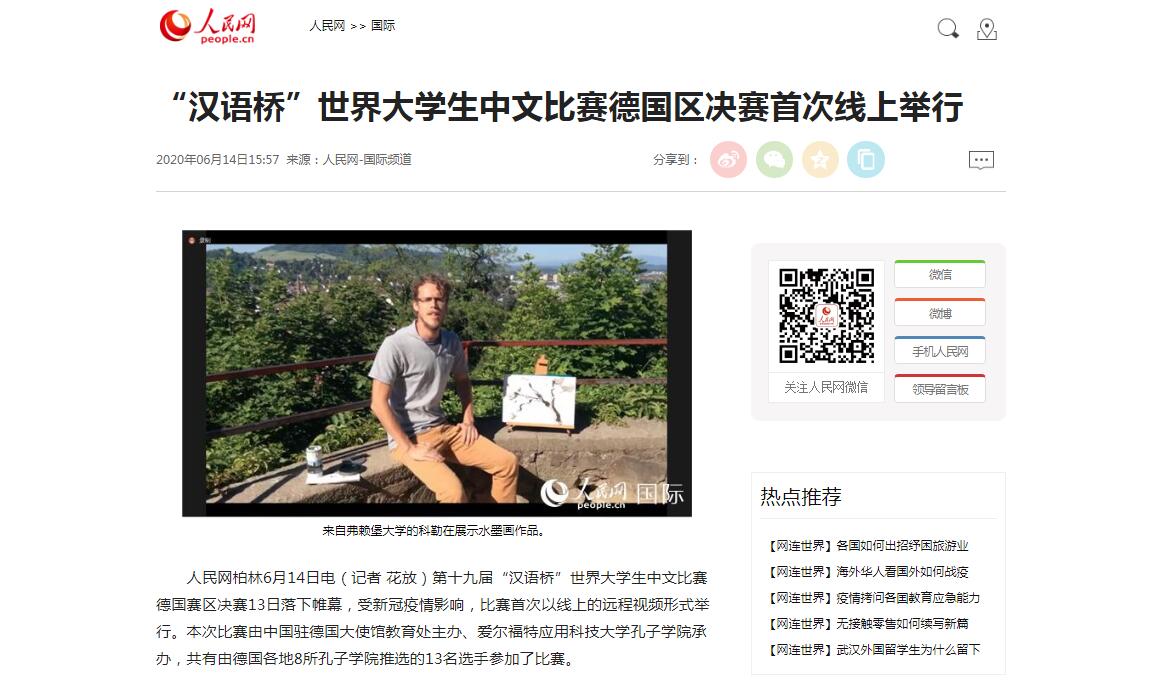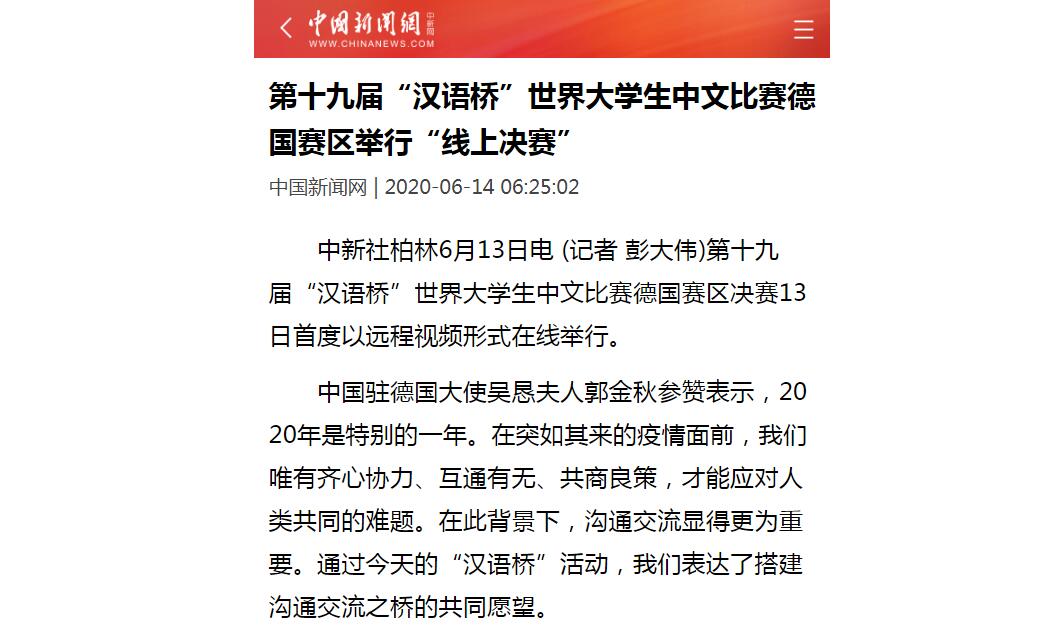 近日,由伟德官网埃尔福特应用科技大学孔子学院协办的第19届“汉语桥”比赛德国赛区决赛落下帷幕。人民日报、新华网、人民网、央视新闻客户端、中国新闻网(点击查看原文)以及欧洲华语媒体《欧洲时报》等对比赛做了报道。