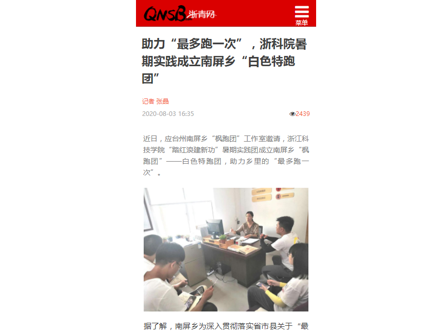 近日,应台州南屏乡“枫跑团”工作室邀请,浙江科技学院“踏红浪建新功”暑期实践团成立南屏乡“枫跑团”——白色特跑团,助力乡里的“最多跑一次”。