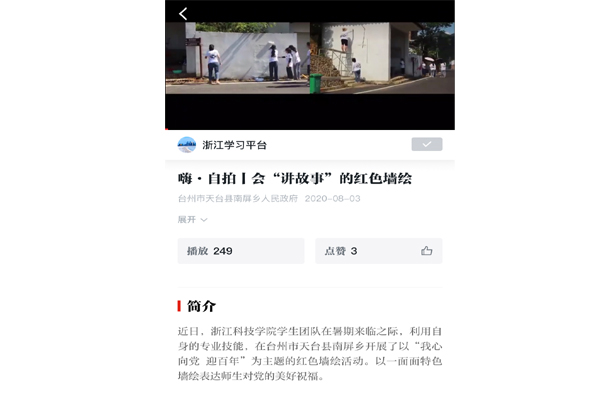 近日,浙江科技学院学生团队在暑期来临之际,利用自身的专业技能,在台州市天台县南屏乡开展了以“我心向党 迎百年”为主题的红色墙绘活动。以一面面特色墙绘表达师生对党的美好祝福。学习强国、小时新闻等媒体对活动进行了报道:学习强国:嗨·自拍丨会“讲故事”的红色墙绘、小时新闻:红色暑期实践 | 我心向党迎百年,同心逐梦绘旗帜。