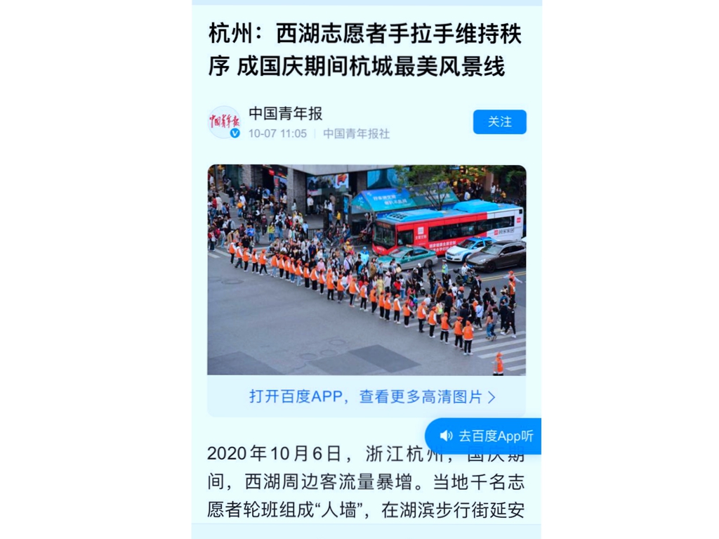 中国青年报:杭州:西湖志愿者手拉手维持秩序 成国庆期间杭城最美风景线