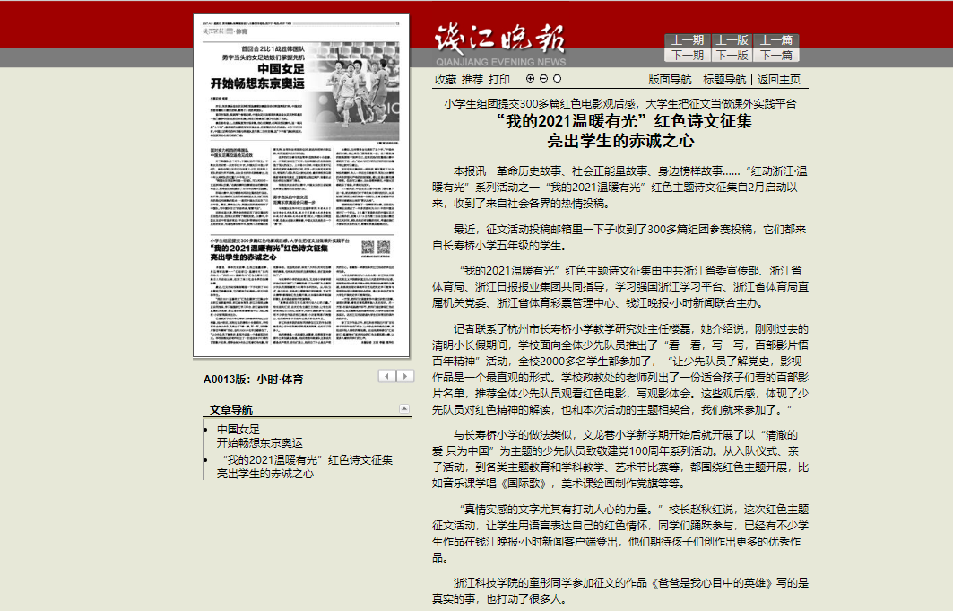 钱江晚报:“我的2021温暖有光”红色诗文征集 亮出学生的赤诚之心