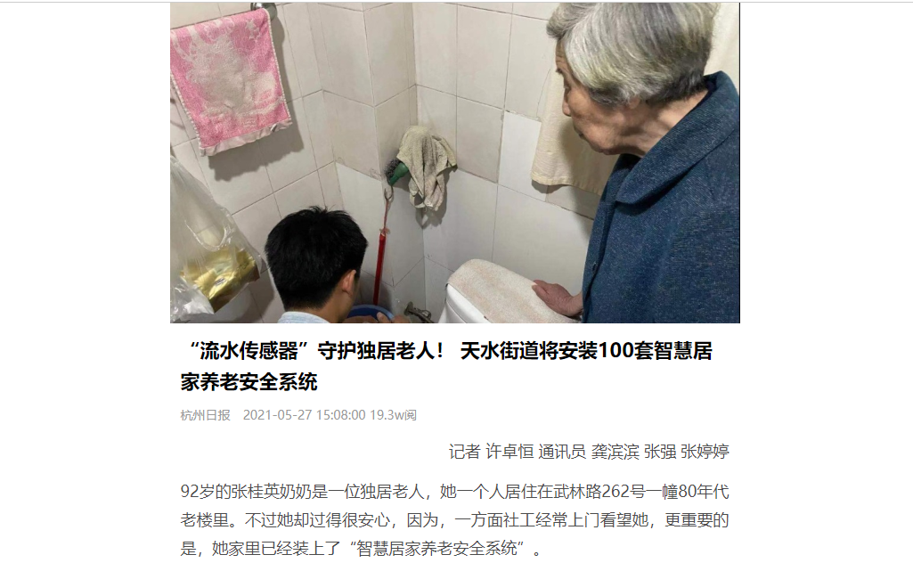 杭+新闻:“流水传感器”守护独居老人! 天水街道将安装100套智慧居家养老安全系统