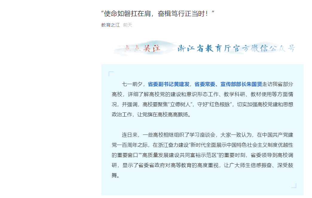 七一前夕,省委副书记黄建发,省委常委、宣传部部长朱国贤走访我省部分高校,详细了解高校党的建设和意识形态工作、教学科研、教材使用等方面情况,并强调,高校要聚焦“立德树人”,守好“红色根脉”,切实加强高校党建和思想政治工作,让党旗在高校高高飘扬。