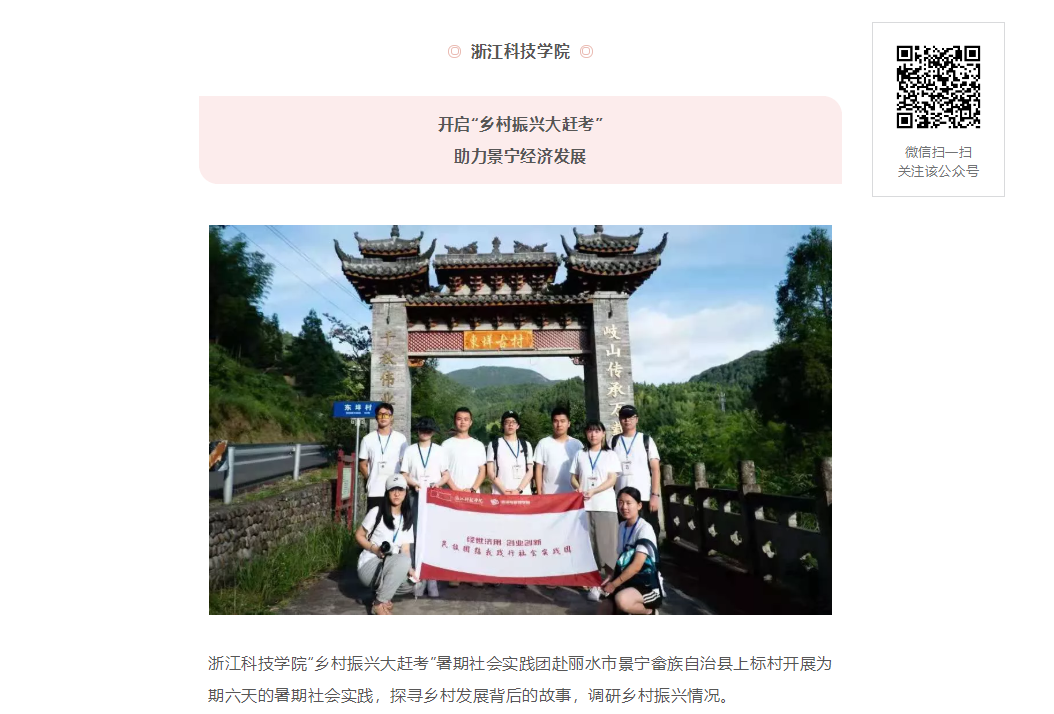 浙江科技学院“乡村振兴大赶考”暑期社会实践团赴丽水市景宁畲族自治县上标村开展为期六天的暑期社会实践,探寻乡村发展背后的故事,调研乡村振兴情况。