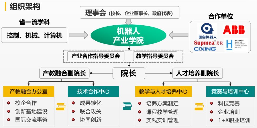 机器人产业学院实行理事会领导下的院长负责制。理事会成员由学校、企业高管、政府代表共同组成,负责产业学院重大事项的审议和决策。