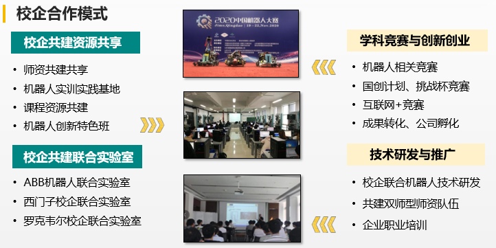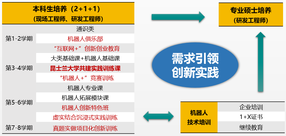 通过优化培养模式,集教学、培训、科研于一体,完善产教融合协同育人机制,培养基础知识好、实践能力强、创新作风实的机器人领域高素质应用型工程类人才。