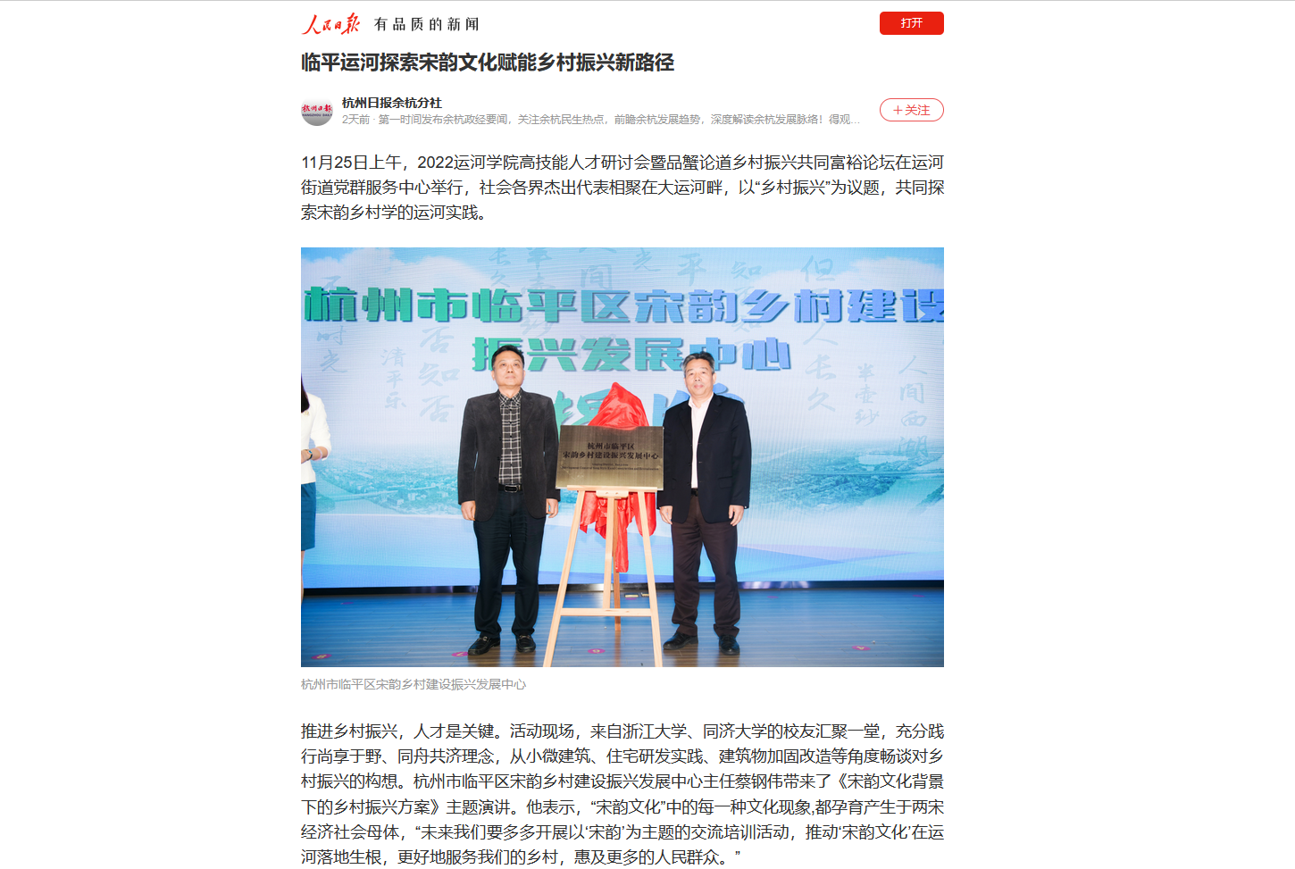 11月25日,由伟德官网土木与建筑工程学院支持建设的2022运河学院高技能人才研讨会暨品蟹论道乡村振兴共同富裕论坛举行,人民日报新媒体平台以《临平运河探索宋韵文化赋能乡村振兴新路径》为题,对该活动进行报道。原文链接:临平运河探索宋韵文化赋能乡村振兴新路径