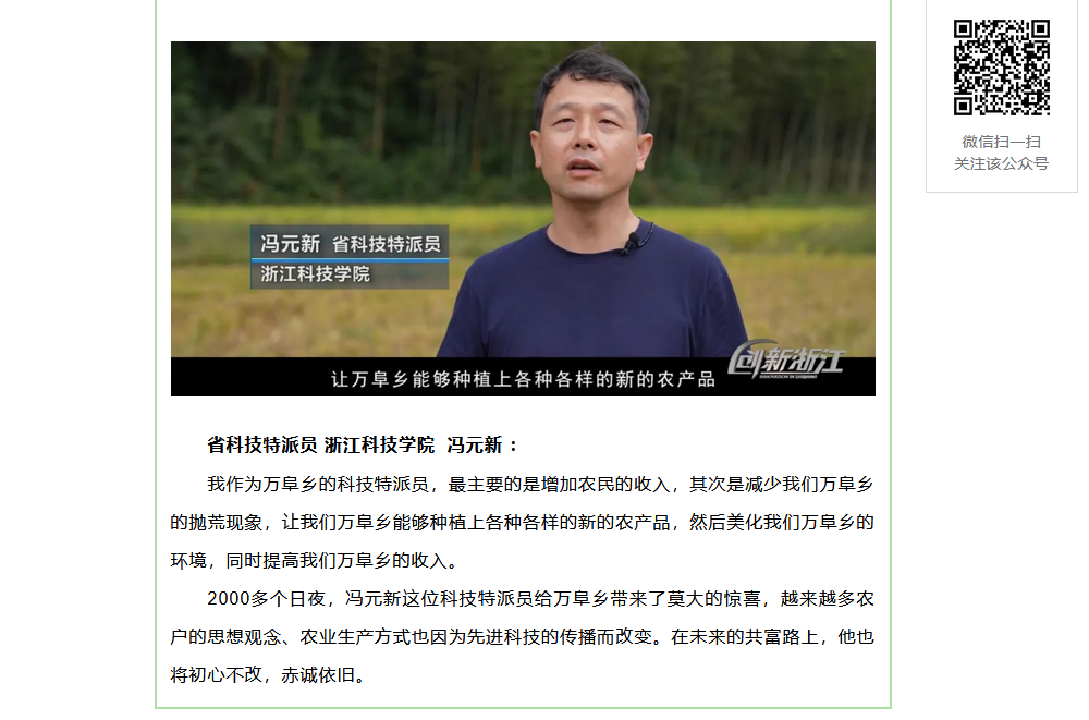 4月15日,浙江经视《创新浙江》栏目、浙江省科学技术厅微信公众号“创新浙江”发布《科技筑起山区共富梦 浙江省科技特派员制度实施20周年系列一》的报道。报道中关注了伟德官网科技特派员冯元新在万阜乡,为实现产业兴、农村美、农民富奉献着自己的智慧和汗水。