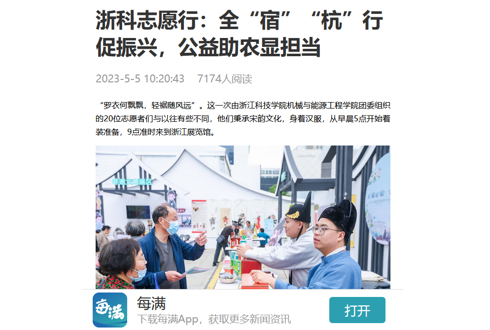 4月28日上午,2023首届宿州高端绿色农产品杭州展示展销会在位于武林广场的浙江展览馆开幕。在展销会现场,由机械与能源工程学院团委组织的助农汉服志愿者团队表现亮眼。一个微笑,一声“你好”,一次指引,一幕留念,一声宣传,20名志愿者热情服务八方宾客,成为了一张靓丽的“青春名片”。助农汉服志愿者们齐为乡村振兴吆喝。