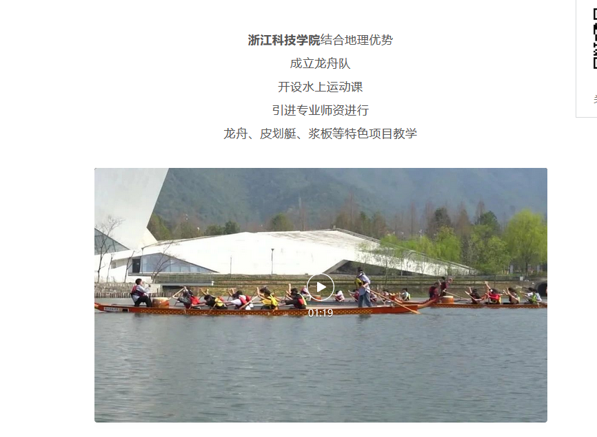 浙江科技学院结合地理优势,成立龙舟队,开设水上运动课,引进专业师资进行龙舟、皮划艇、浆板等特色项目教学。