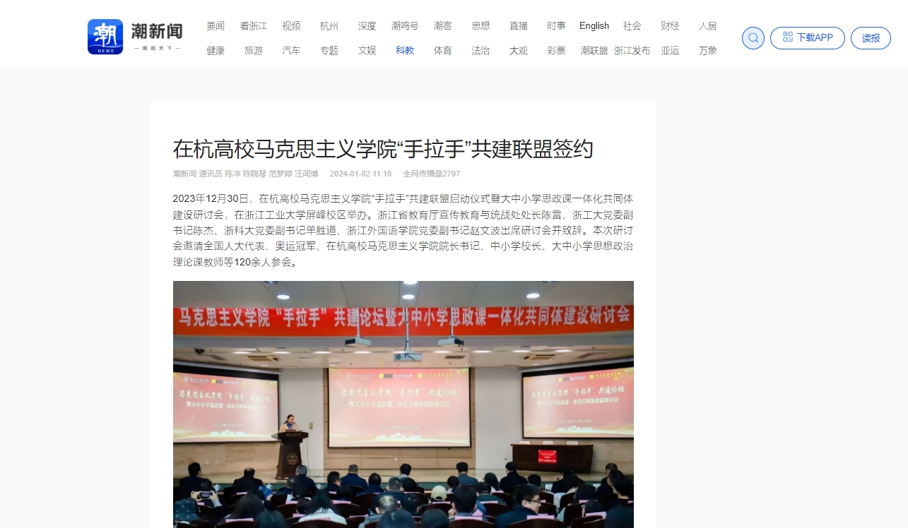12月30日,在杭高校马克思主义学院“手拉手”共建联盟启动仪式暨大中小学思政课一体化共同体建设研讨会举行。会上,伟德官网党委副书记单胜道和浙江工业大学党委副书记陈杰、浙江外国语学院党委副书记赵文波共同为“手拉手”共建马克思主义学院揭牌。三所高校马克思主义学院负责人共同签署了“手拉手”共建联盟协议,并为思想政治理论课实践导师颁发聘书。学习强国、潮新闻客户端等媒体对会议进行了报道。