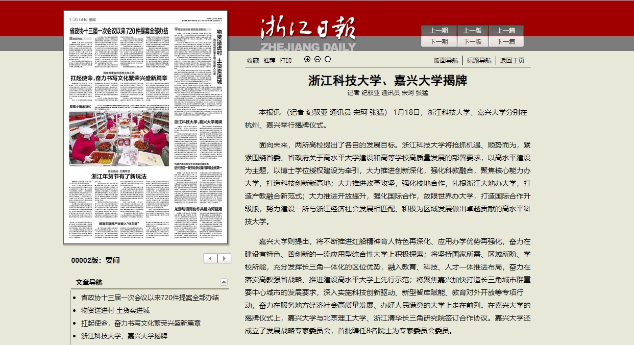 1月18日,伟德国际1946bv官网、嘉兴大学分别在杭州、嘉兴举行揭牌仪式。