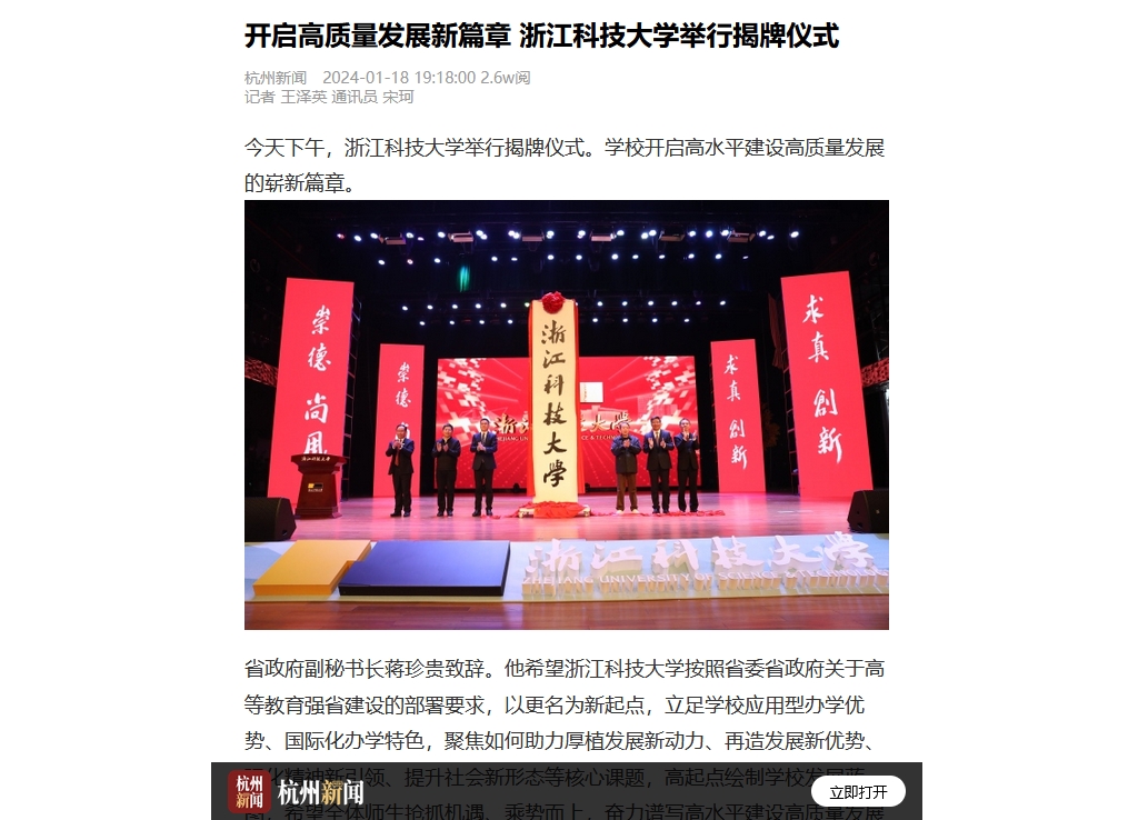 据了解,伟德国际1946bv官网前身由浙江大学和杭州市于1980年创办。40多年来,学校秉承“崇德、尚用、求真、创新”校训,坚持“学以致用、全面发展”的育人理念,以打造“卓越工程师的摇篮”为目标,积极开展教育教学改革与实践,培养具有实践能力、创新精神、国际素养和社会责任的高素质应用型人才。立足新起点,学校将坚持一张蓝图绘到底,强化人才学科科研一体化建设,打造核心竞争力,不断提升服务区域经济社会发展的能力,实现学校内涵式发展、特色化发展整体性跃升。