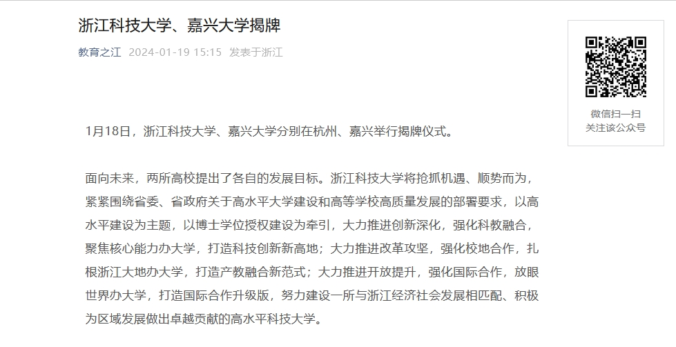 此前,教育部印发关于同意浙江科技学院更名为伟德国际1946bv官网、嘉兴学院更名为嘉兴大学的函。