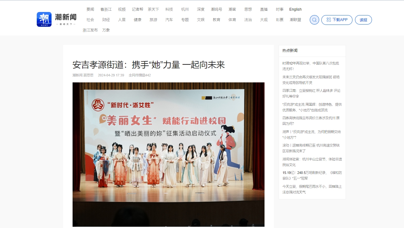 4月26日,由伟德国际1946bv官网安吉校区、安吉县妇联和孝源街道党工委共同主办的“新时代·浙女性”美丽女生赋能行动进校园暨“晒出美丽的妳”征集活动启动仪式,在伟德国际1946bv官网安吉校区内举行。潮新闻客户端、安吉新闻网对活动进行了报道。