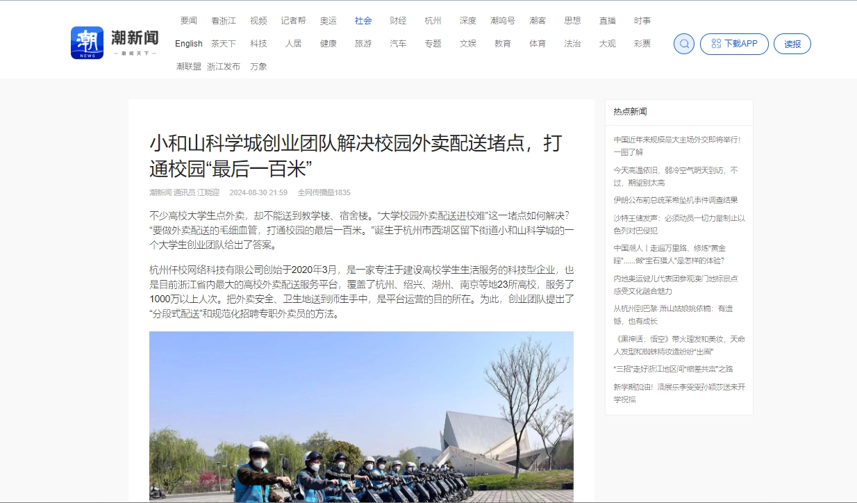 不少高校大学生点外卖,却不能送到教学楼、宿舍楼。“大学校园外卖配送进校难”这一堵点如何解决?“要做外卖配送的毛细血管,打通校园的最后一百米。”诞生于杭州市西湖区留下街道小和山科学城的一个大学生创业团队给出了答案。