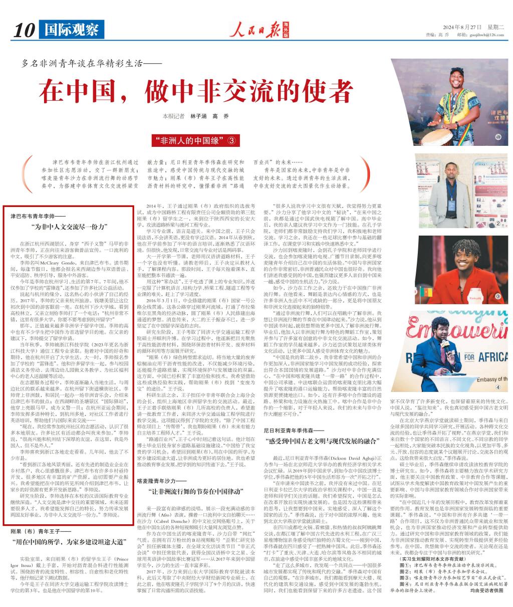 2024年中非合作论坛峰会召开前夕,《人民日报》海外版推出“非洲人的中国缘”系列报道。8月27日该系列推出整版报道《在中国,做中非交流使者》,讲述了伟德官网津巴布韦籍留学生李帅等3位非洲青年的故事。9月4日浙江卫视“新闻深一度”也关注了李帅参加志愿服务,推进中非青年交流的故事。以下为报道内容: