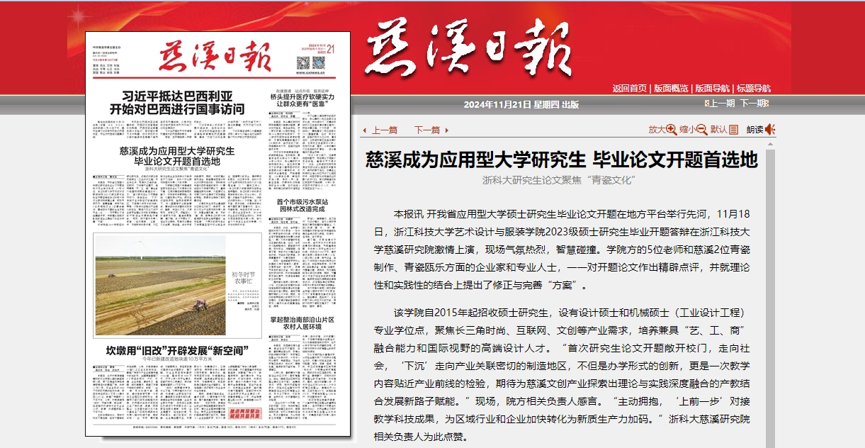 该学院自2015年起招收硕士研究生,设有设计硕士和机械硕士(工业设计工程)专业学位点,聚焦长三角时尚、互联网、文创等产业需求,培养兼具“艺、工、商”融合能力和国际视野的高端设计人才。“首次研究生论文开题敞开校门,走向社会,‘下沉’走向产业关联密切的制造地区,不但是办学形式的创新,更是一次教学内容贴近产业前线的检验,期待为慈溪文创产业探索出理论与实践深度融合的产教结合发展新路子赋能。”现场,院方相关负责人感言。“主动拥抱,‘上前一步’对接教学科技成果,为区域行业和企业加快转化为新质生产力加码。”浙科大慈溪研究院相关负责人为此点赞。