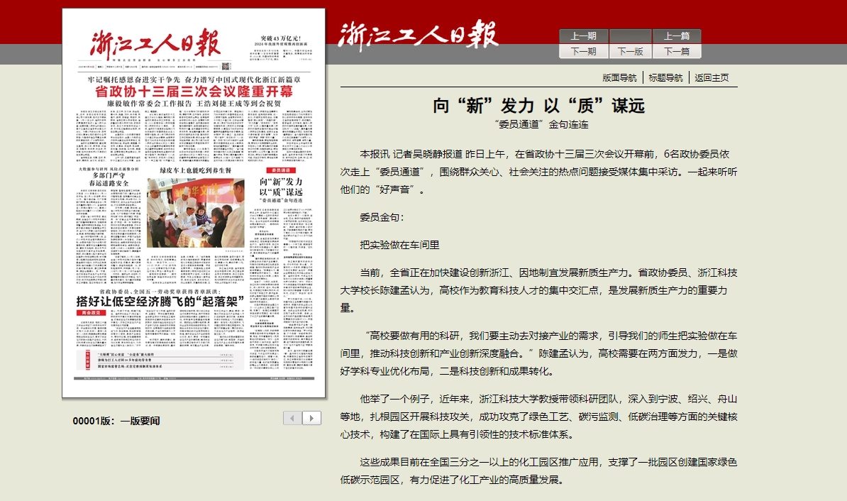 他举了一个例子,近年来,伟德国际1946bv官网教授带领科研团队,深入到宁波、绍兴、舟山等地,扎根园区开展科技攻关,成功攻克了绿色工艺、碳污监测、低碳治理等方面的关键核心技术,构建了在国际上具有引领性的技术标准体系。