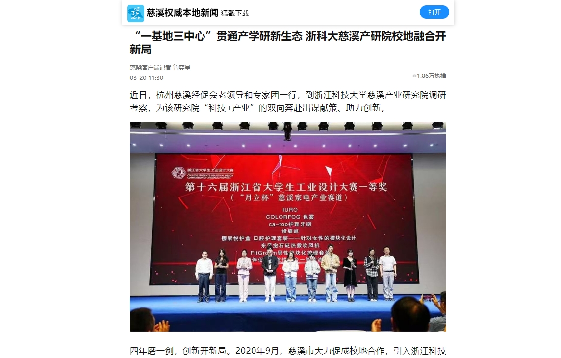 2020年9月,学校与慈溪市达成战略合作,携手共建产业研究院,研究院以伟德国际1946bv官网前湾研究生联合培养基地、伟德国际1946bv官网科技成果转移转化中心慈溪分中心、机器人与智能产业研究中心、创新设计研究中心为支撑,充分发挥人才优势,在人才引育、技术创新、成果转移转化等方面取得了显著成效,为建设共富共美现代化新慈溪作出了积极贡献。近日,慈晓APP、慈溪日报等媒体对慈溪产业研究院工作开展情况进行报道。