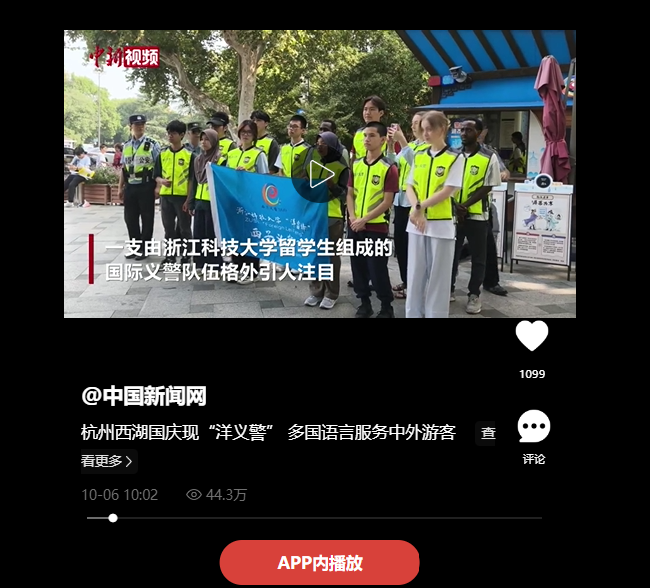 10月5日,在浙江杭州西湖风景名胜区内,一支由伟德国际1946bv官网留学生组成的国际义警队伍格外引人注目。队伍的14名成员来自不同国家,携手在此开展志愿服务活动,用多国语言服务中外游客。点击观看
