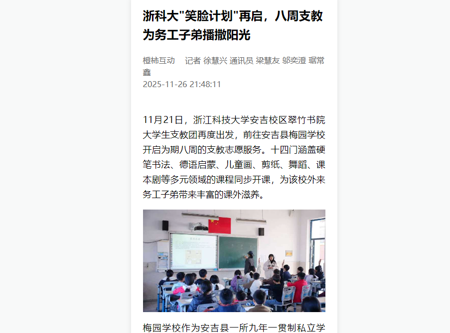梅园学校作为安吉县一所九年一贯制私立学校,学生多为当地外来务工人员子女,普遍面临学习水平参差不齐、普通话能力薄弱等问题,部分学生放学后还需承担家务劳动,学习时间受限。“支教团的到来是雪中送炭!”学校教务主任安老师坦言,面对学生复杂的家庭环境和学业基础,老师们一直希望能为孩子们争取更多帮扶资源,支教团的入驻让全校师生倍感振奋。