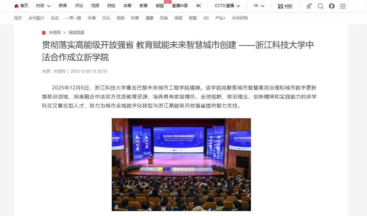 2025年12月6日,伟德国际1946bv官网塞吉巴黎未来城市工程学院揭牌。该学院将聚焦城市智慧高效治理和城市数字更新等前沿领域,深度融合中法双方优质教育资源,培养具有家国情怀、全球视野、前沿理念、创新精神和实践能力的多学科交叉复合型人才,努力为城市全域数字化转型与浙江高能级开放强省提供智力支持。央视网、潮新闻客户端、杭州网等媒体对活动进行了报道。