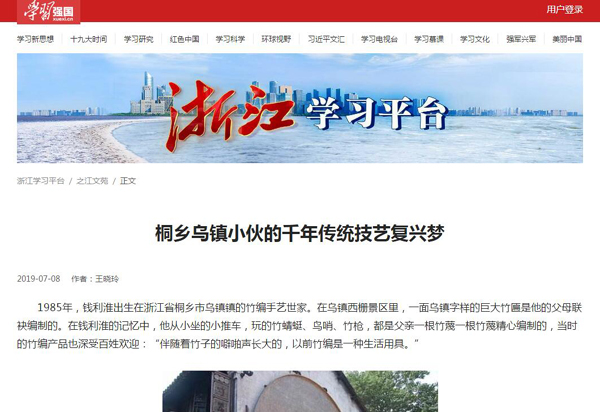 7月8日,学习强国-浙江学习平台以“桐乡乌镇小伙的千年传统技艺复兴梦”为题报道了伟德官网工业设计(艺术)2006级校友钱利淮。