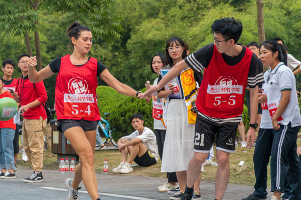 整个队伍浩浩荡荡,参跑者沿预定跑道一路向前。汽车服务工程181许淑瑜所在学院男女比例失衡严重,“被参赛”的她笑着打趣,虽然参加这次活动是一场意外,可自己一点都没有含糊,“前几天本来想着去献血的,但想着要为这次活动好好保存体力,还是放弃了”。谈到这次环校跑活动印象最深的地方,许淑瑜回忆道,“本来我是跑第三棒的,但是第三棒的那一段路是上坡,学院里的男生很贴心地主动和我换,让我跑平地,可以不用那么吃力。”