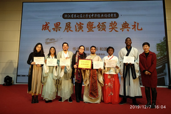 伟德官网选派集体组1支队伍、留学生组2支队参加比赛。经过专家评审和现场决赛,伟德官网以津巴布韦籍学生李帅、委内瑞拉籍学生李渊、哥伦比亚籍学生何心琳、也门籍学生萨岚、加纳籍学生甄妮、印度尼西籍学生黄瑗爱等六人组成的两支留学生参赛队伍,分别以《忆江南》《关睢·洛神赋·明月上高楼》朗诵作品,以全省第一、二名的成绩获得省一等奖,并代表浙江省参加国赛分别获三等奖和优秀奖;汉语言文学172谢珊获本科组个人一等奖,工业设计171何鑫林、物联网工程171左世帆和集体组项目分获二等奖,艺术设计18级沙煜博、财务管理171胡鑫敏、食品科学与工程171史灏煜、材料科学与工程172袁伟栋4人分获个人组三等奖。伟德官网获省优秀组织奖,程永艳、魏建华2位老师等获优秀指导教师奖。