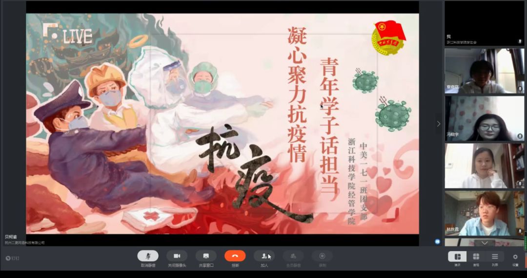 “作为在校大学生,我们更应珍惜光阴,将‘停课不停学、学习不延期’,努力学习作为自己最大的责任与使命,积蓄起为国分忧、为民担当的智慧和力量。”经济与管理学院经济学(中美班)171团支部冯晓宇说道。在主题团日活动中,浙江省青联副秘书长宋元菁与团支部全体同学一起共话疫情之下的青年责任和担当。同学们认真学习习近平总书记在统筹推进新冠肺炎疫情防控和经济社会发展工作部署会议重要讲话精神和习近平总书记给西藏大学医学院学生的回信精神,围绕校党委书记龚建立教授2020年春季学期“开学第一课”开展讨论,发表感悟,抓好团员青年疫情防控期间的思想政治引领。活动中,返乡参与志愿服务的同学与大家分享了自己志愿服务感悟。