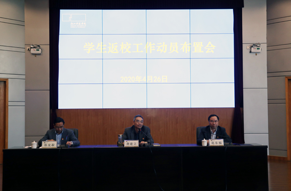 4月26日下午, 学校召开学生返校工作动员布置会。校党委书记龚建立对下一阶段工作提出要求。校长赵东福就学生返校工作作总体部署。副校长郑友取就疫情防控注意事项说明。校党政班子成员、校长助理出席会议。全体中层干部、处长(院长)助理参加会议。