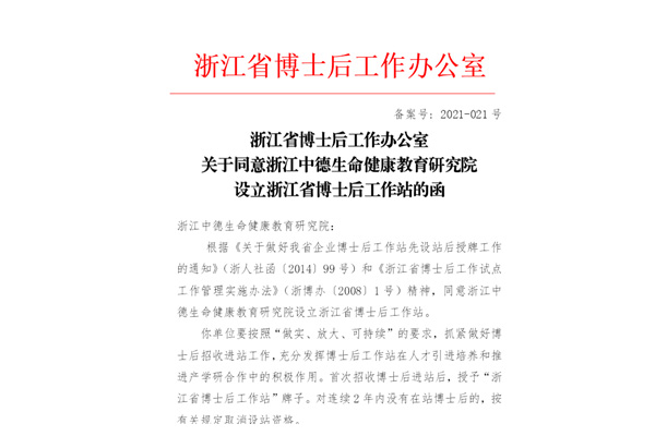 近日,浙江中德生命健康教育研究院获得省博士后工作办公室批准,成功设立伟德官网首个博士后工作站。