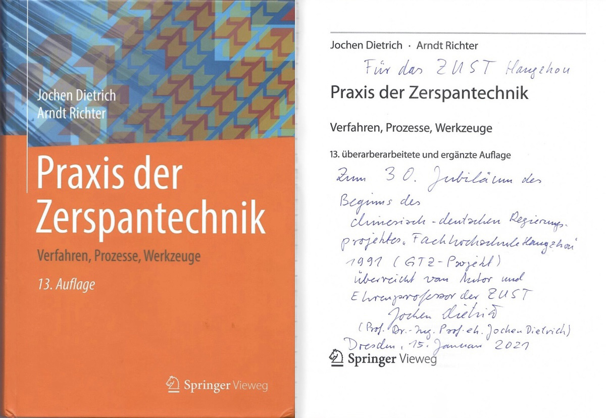 新学期伊始,伟德官网名誉教授、德国德累斯顿技术经济大学教授约亨·迪特里希(Prof.Dr.-Ing. Jochen Dietrich)向伟德官网邮寄捐赠其新出版的学术专著《切削加工技术实践(第13版)》,校长赵东福代表学校给迪特里希教授和德累斯顿技术经济大学回信。