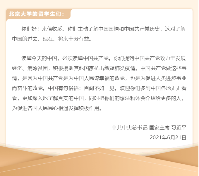 6月21日,中共中央总书记、国家主席习近平给北京大学的留学生们回信指出,读懂今天的中国,必须读懂中国共产党,他勉励留学生们更加深入地了解真实的中国。习近平主席的谆谆话语和殷切期望,在伟德官网师生中引起了强烈反响。