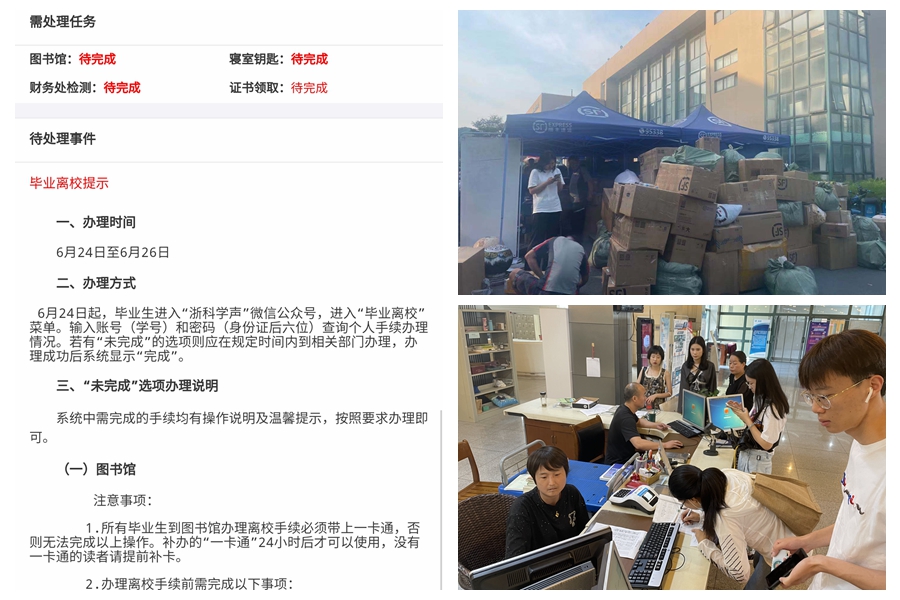 进入毕业离校系统完成毕业离校手续办理,在图书馆设置“多平台虚拟缴费”终端让学生少跑腿,联系物流公司助学生轻松离校……今年毕业季,为服务应届毕业生顺利离校,学校多个部门实施了多项暖心举措。
