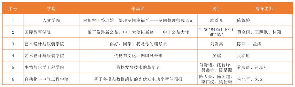 艺术设计与服装学院的参赛项目《服章之美亦华夏 自媒传承在今朝》(参赛选手:康超,指导教师:陈婉婷、吴春胜、陈名)获得职业规划类本研组一等奖,并被授予“2021年浙江省最佳职业规划之星”,项目指导教师被授予大赛优秀指导教师称号。人文学院参赛项目《非遗捏塑耕种新土地上的美丽乡村》(参赛选手:郑倾城、陈冉、应骐蔚、肖静雅,指导教师:李俊、叶晗)获创新创意类本研组三等奖,优胜奖获奖信息详见下表。
