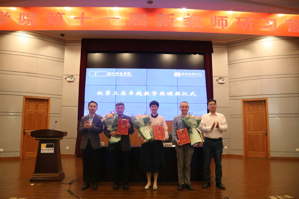 会议对第三届校卓越教学奖获得者进行表彰。校领导为各学院新教师代表佩戴校徽、颁发工作证。