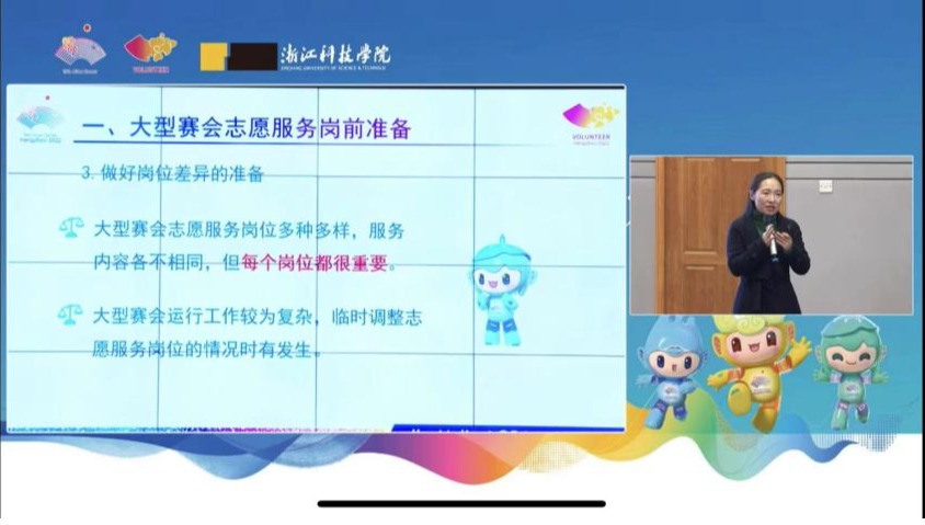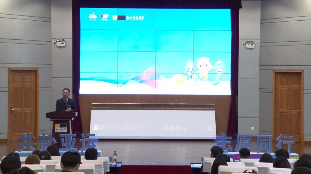 3月5日,2023年“志愿服务月”启动仪式暨杭州亚运赛会补充招募志愿者培训开班式举行,校党委副书记冯军出席。浙江省黄龙体育中心、校团委负责人,亚运会志愿服务领队教师,优秀志愿者代表以及通过补录面试的亚运会志愿者们参加活动,安吉校区志愿者通过网络直播收看活动。