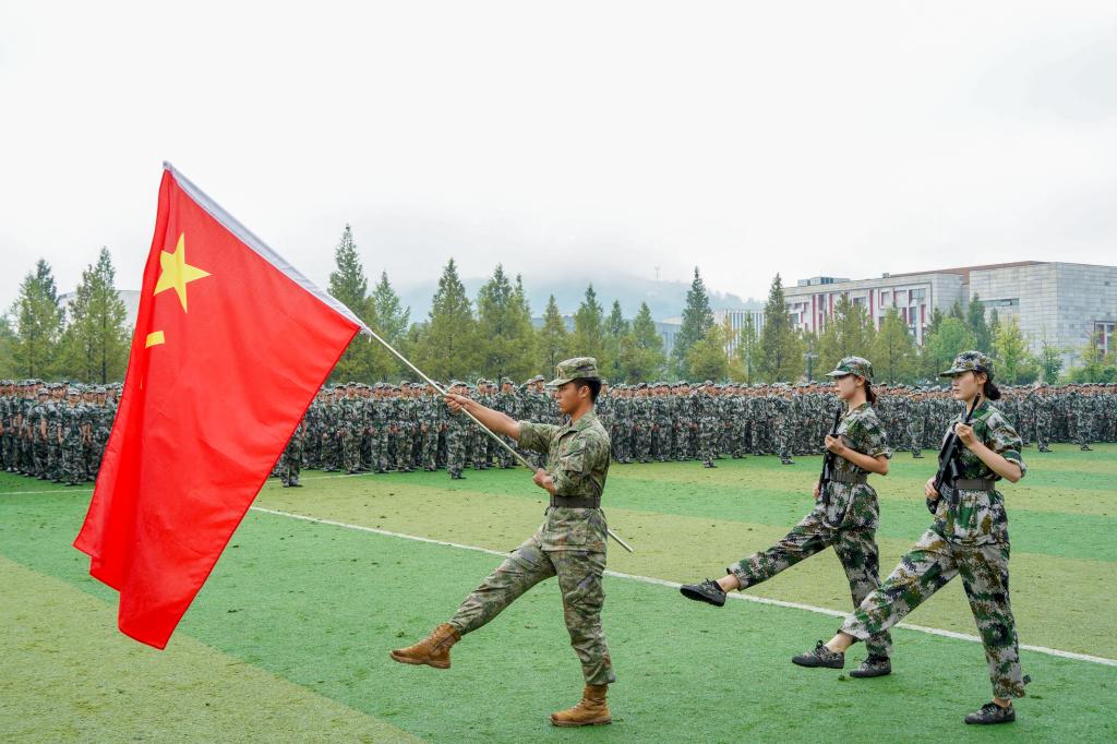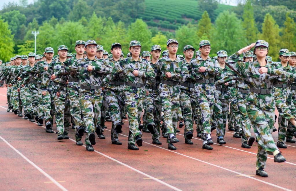汇报表演中,阅兵式、分列式和军训科目展示相继举行。身着戎装的新生喊着铿锵有力的口号,迈着整齐矫健的步伐,展示自己的训练成果。