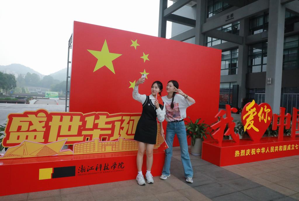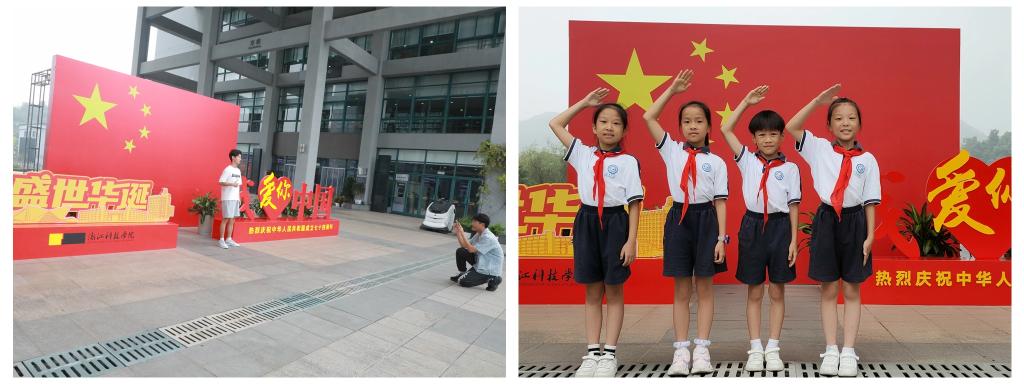 “快来,我们来和国旗合个影。”近日,小和山校区正门的一组红色文化小品成为新的打卡点,巨幅国旗和祝福国庆立体字留住来往师生的脚步,连来校园里放松的附近社区儿童也在这留下美好一瞬。