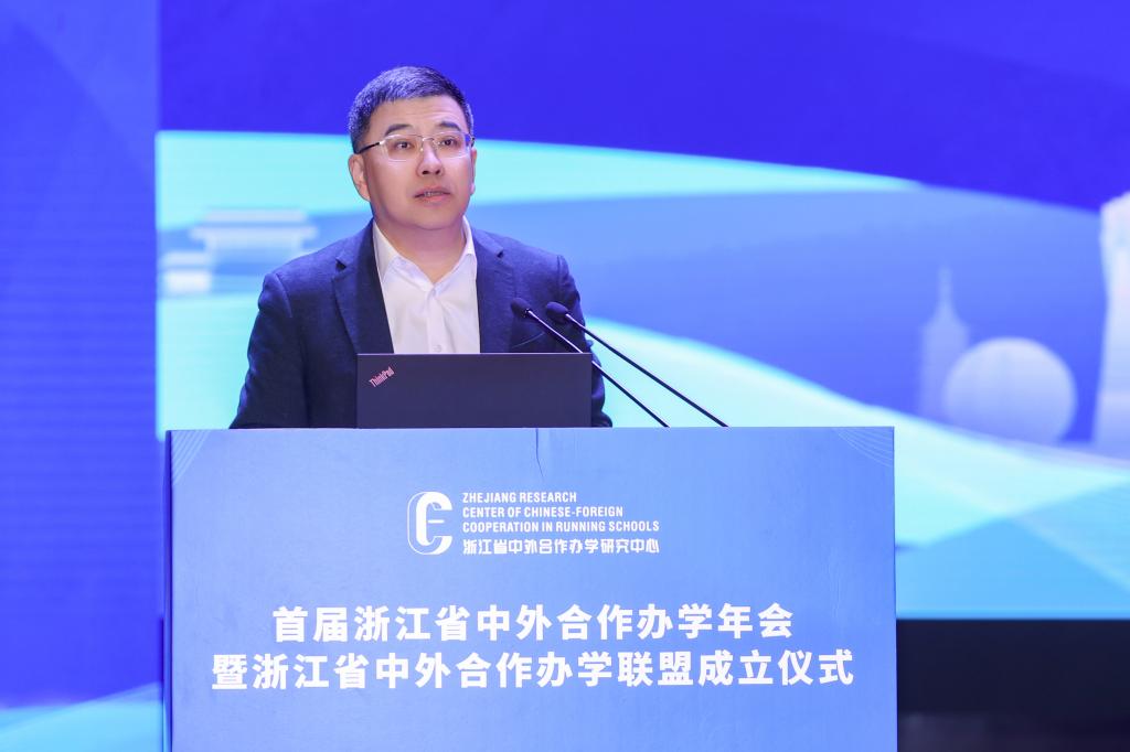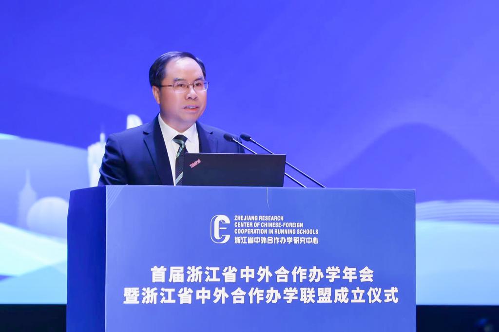 舒培冬在致辞中表示,作为教育对外开放的主要阵地,中外合作办学承担了越来越重要的使命。2023年,我省全面启动全国唯一一个中外合作办学高质量发展改革创新试验区建设,以先行先试为契机,正式吹响浙江探索中外合作办学高质量发展路径的集结号。为努力形成浙江样板、浙江经验,省教育厅在伟德国际1946bv官网设立了浙江省中外合作办学研究中心,近期又发起设立“浙江省中外合作办学联盟”的倡议,旨在为全省高校搭建一个信息共享、互学互鉴的交流平台。他希望联盟各成员高校通力合作,希望研究中心充分发挥咨政服务作用,为试验区建设提供理论支撑和智力支持。