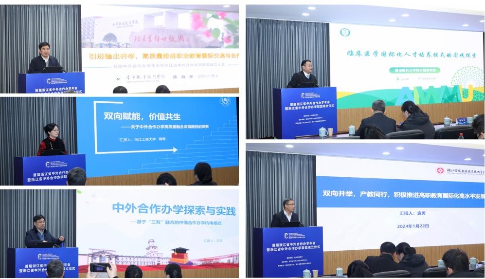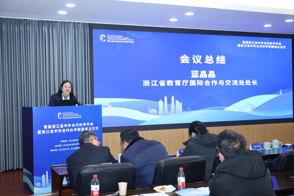 年会上,浙江省中外合作办学研究中心、浙江大学、宁波诺丁汉大学、温州肯恩大学作大会主旨报告,浙江工商大学、杭州电子科技大学、温州医科大学、金华职业技术学院、浙江纺织服装职业技术学院作高质量发展论坛报告。蓝晶晶作会议总结。