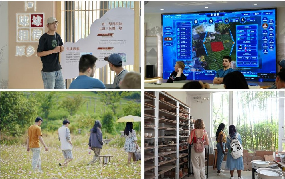 留学生第一站来到了茶园集市,漫山遍野的西湖龙井茶树映入眼帘,来自蒙古的明花同学赞叹:“第一次看到这么大的茶园,太壮观了,同时智慧茶园物联网系统,太先进了。”顺着茶园小道,漫步环绕村庄,来到了白桦林手作园。在这里,留学生们自由参观了各类艺术工作室,近距离与艺术家们进行了交流,来自罗马尼亚的程乐乐同学表示,“让艺术走进乡村,让生活更艺术,这个村庄与艺术结合地如此之好,大大丰富了村民的精神生活。”在长埭村党群服务中心,相关负责人细介绍了长埭村的发展历程,讲解了村庄“产业引领共富,艺术点亮乡村”的乡村振兴、共同富裕新模式。印尼留学生苏友仁感叹:“长埭村共同富裕的理念非常值得我们国家学习和借鉴。”